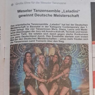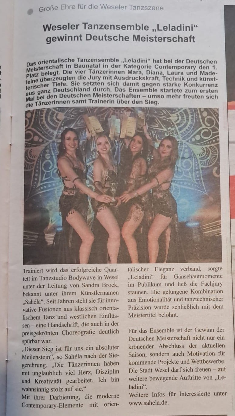 Wesel / Baunatal, 27. September 2025 – Große Ehre für die Weseler Tanzszene: Das orientalische Ensemble Leladini hat bei der Deutschen Meisterschaft in Baunatal in der Kategorie Contemporary den 1. Platz belegt. Die vier Tänzerinnen Mara, Diana, Laura und Madeleine überzeugten die Jury mit Ausdruckskraft, Technik und künstlerischer Tiefe – und setzten sich gegen starke Konkurrenz aus ganz Deutschland durch.